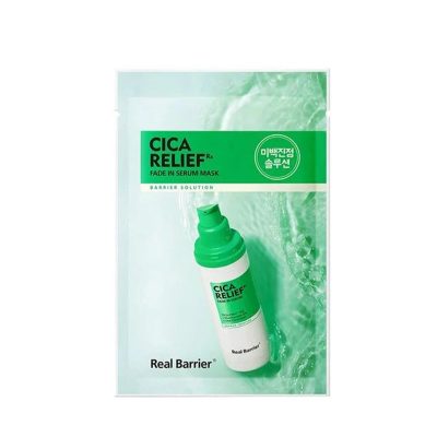 Заспокійлива експрес-маска Real Barrier Cicarelief Rx Fade In Serum Mask з комплексом CICA виготовлена з особливого волокна на основі центели азійської, яке м’яко діє на шкіру, мінімізуючи ризик виникнення свербіння та подразнень. Маска швидко знижує температуру шкіри, усуває почервоніння та сприяє загоєнню запалень. Вона зміцнює шкіру, зменшує прояви куперозної сітки та розацеа.