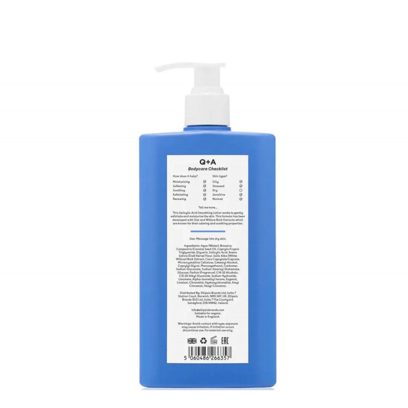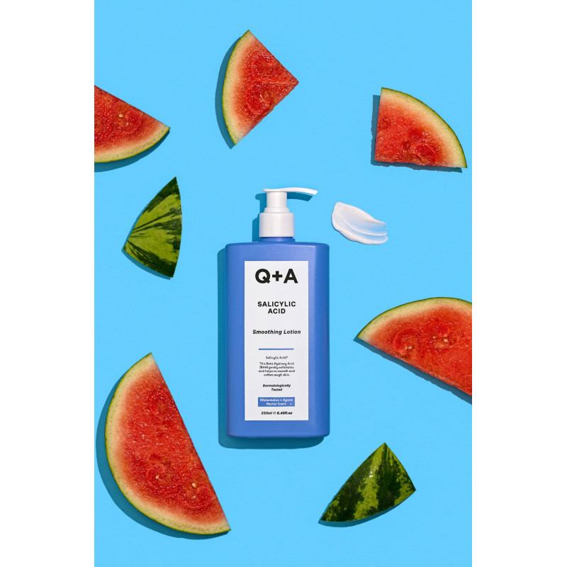 Заспокійливий лосьйон для тіла з саліциловою кислотою Q&A Salicylic Acid Smoothing Lotio розроблений спеціально для відновлення гарного стану шкіри. Засіб ніжно відлущує та видаляє відмерлі клітини, завдяки чому забезпечує шкірному покриву рівний тон і гладеньку текстуру. Склад додатково збагачений компонентами, які глибоко зволожують, заспокоюють та пом’якшують шкіру. Насичена, проте легка консистенція продукту не залишає на тілі відчуття липкості та жирності. Аромат лосьйону приємно вражає солодко-свіжим звучанням кавуна, нектару агави, кактусової води, орхідеї та тропічних фруктів.